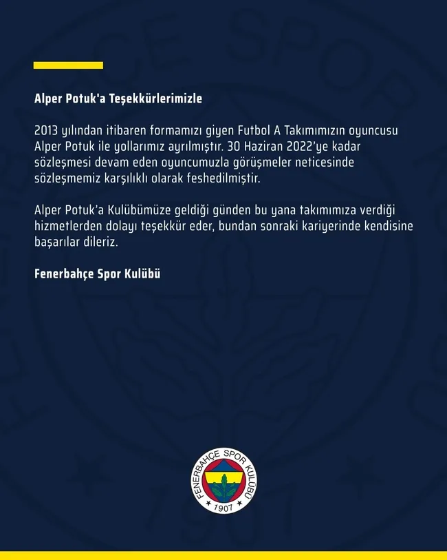 Sarı-lacivertli kulüpten yapılan açıklamada, 30 Haziran 2022'ye kadar kontratı bulunan 29 yaşındaki futbolcunun sözleşmesinin karşılıklı anlaşılarak feshedildiği vurgulandı. Fenerbahçe, Alper Potuk'a teşekkür ederek kariyerinin devamında başarı diledi.