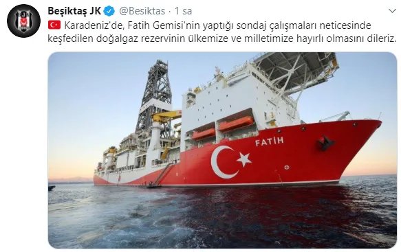 Beşiktaş: "Karadeniz'de, Fatih Gemisi'nin yaptığı sondaj çalışmaları neticesinde keşfedilen doğalgaz rezervinin ülkemize ve milletimize hayırlı olmasını dileriz."