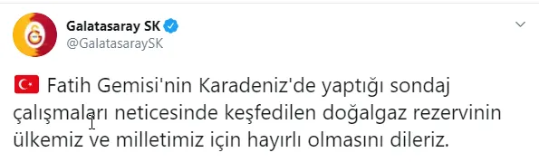 Galatasaray: "Fatih Gemisi'nin Karadeniz'de yaptığı sondaj çalışmaları neticesinde keşfedilen doğalgaz rezervinin ülkemiz ve milletimiz için hayırlı olmasını dileriz."