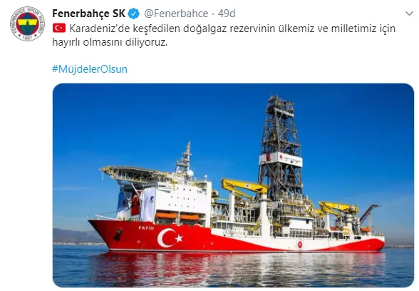 Fenerbahçe: "Karadeniz'de keşfedilen doğalgaz rezervinin ülkemiz ve milletimiz için hayırlı olmasını diliyoruz."