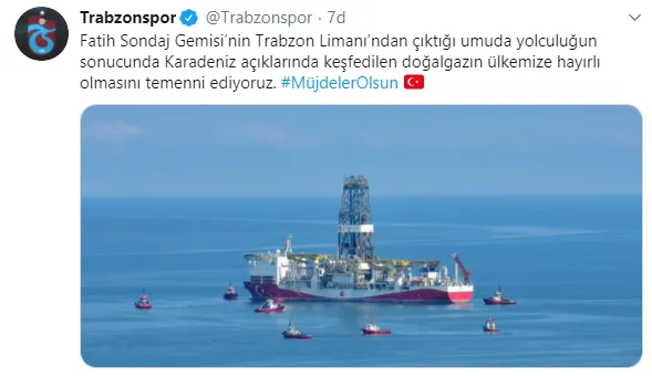 Trabzonspor: "Fatih Sondaj Gemisi'nin Trabzon Limanı'ndan çıktığı umuda yolculuğun sonucunda Karadeniz açıklarında keşfedilen doğalgazın ülkemize hayırlı olmasını temenni ediyoruz."