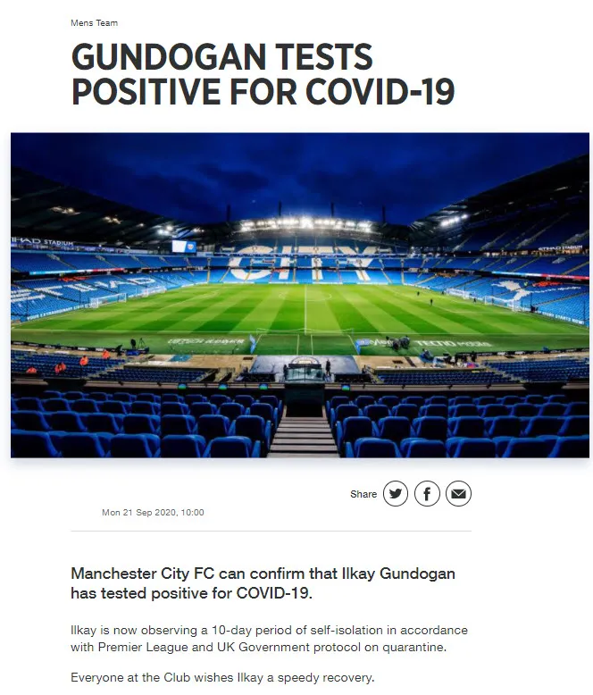 Premier Lig ekibinden yapılan açıklamada, deplasmanda oynanacak Wolverhampton maçı öncesi yapılan corona virüsü testlerinde Türk asıllı Alman yıldız İlkay Gündoğan'ın testinin pozitif çıktığı açıklandı.