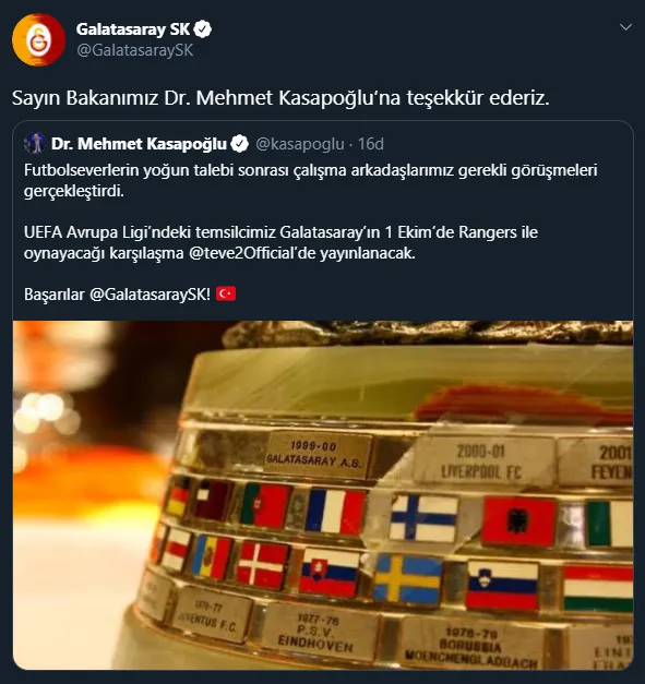 Bakan Kasapoğlu yaptığı paylaşımda, "Futbolseverlerin yoğun talebi sonrası çalışma arkadaşlarımız gerekli görüşmeleri gerçekleştirdi.UEFA Avrupa Ligi'ndeki temsilcimiz Galatasaray'ın 1 Ekim'de Rangers ile oynayacağı karşılaşma teve2'de yayınlanacak. Başarılar Galatasaray" ifadelerini kullandı.