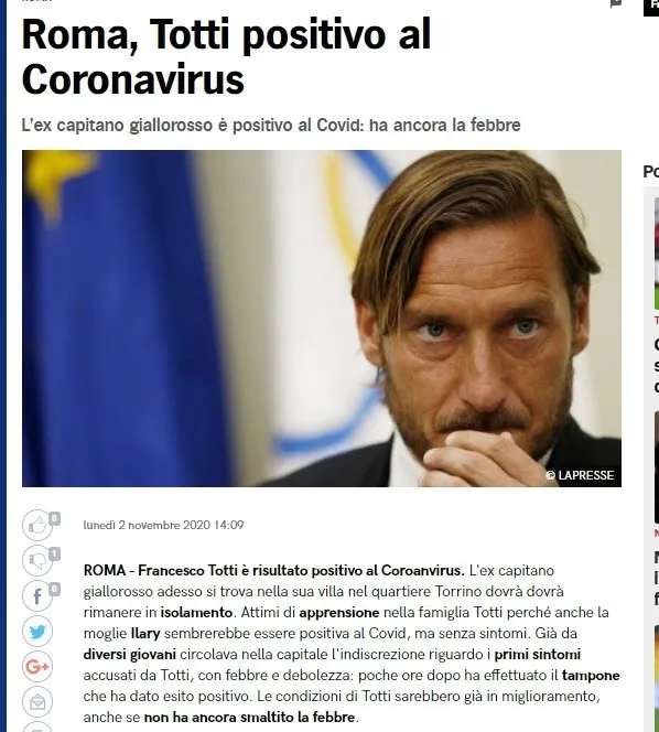 İtalya'nın önde gelen gazetelerinden biri olan Corierre dello Sport, 44 yaşındaki Totti'nin corona virüsüne yakalandığını açıkladı.