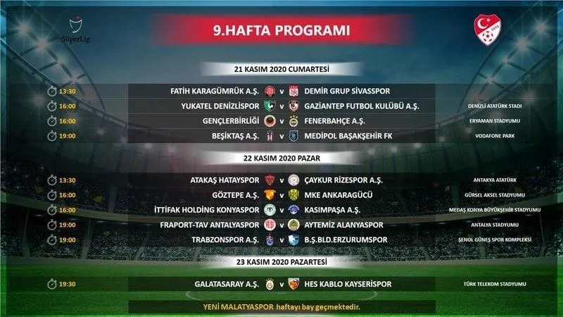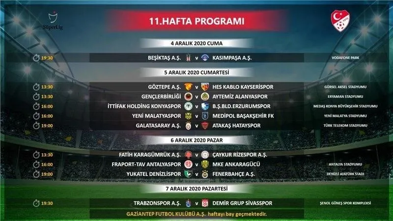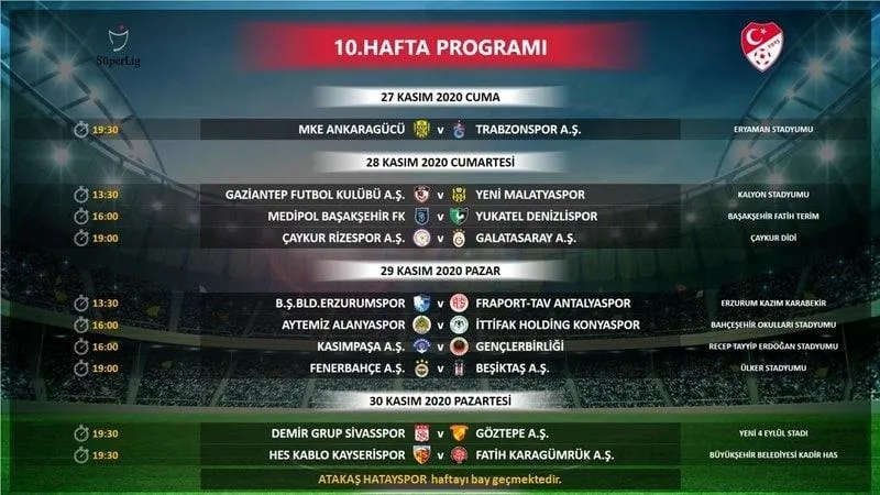 Programa göre Fenerbahçe - Beşiktaş derbisi 29 Kasım Pazar günü 19:00'da oynanacak. Atakaş Hatayspor-Büyükşehir Belediye Erzurumspor ve Göztepe-Aytemiz Alanyaspor maçları için de TFF'den açıklama geldi.