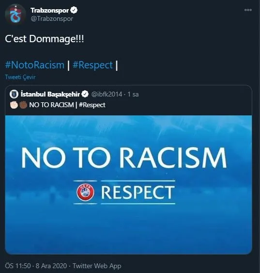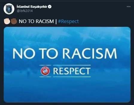 PSG - Başakşehir arasında oynanan karşılaşamdan yaşanan ırkçılığı ekibimiz sosyal medya hesabından duyurdu. Başakşehir yaptığı paylaşımda, "Yardımcı antrenörümüz Pierre Webo'ya ırkçılık yapıldı ancak Webo oyundan atıldı. Oyun bir süredir durmuş vaziyette." ifadelerini kullandı. Başakşehir ikinci paylaşımında ise "Irkçılığa hayır" notunu düştü. Başakşehir'in "Irkçılığa hayır" paylaşımını Paris Saint-Germain de retweet etti.