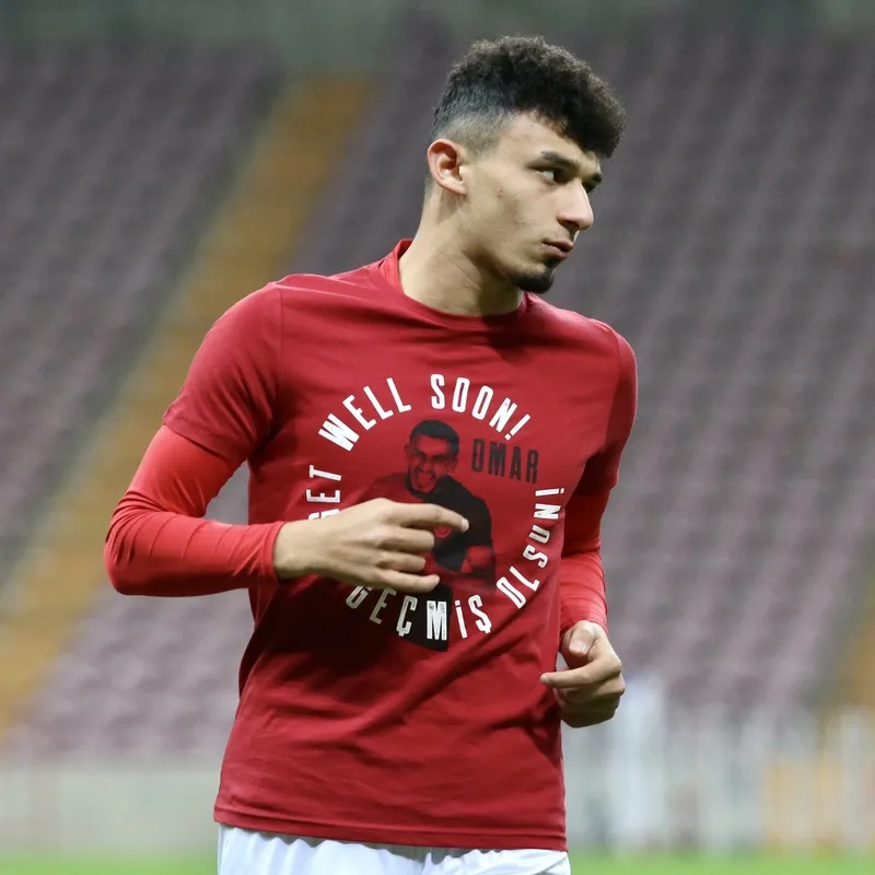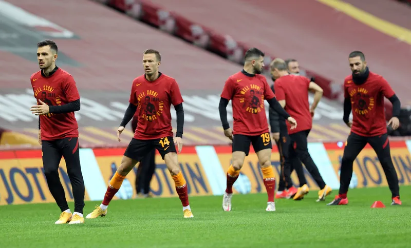 Galatasaray ve Antalyasporlu futbolcular, maç öncesi ısınmaya Omar Elabdellaoui'ye özel tişörtlerle çıktı.