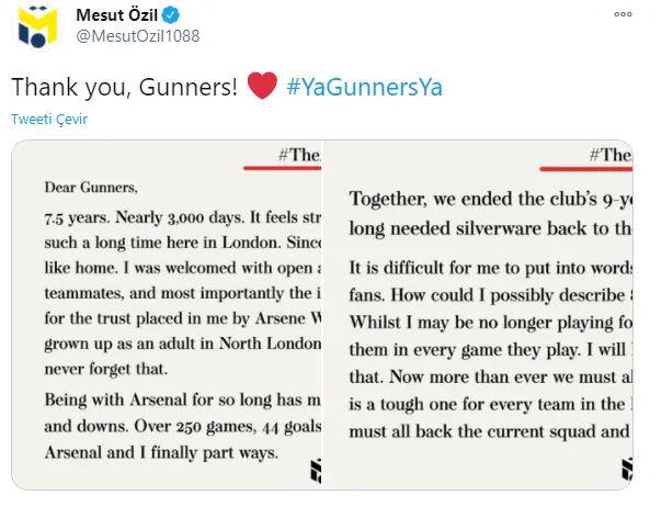 Sarı-lacivertli ekibe gelerek yeni bir sayfa açan Mesut Özil de hem Arsenal'e hem de Arsenal taraftarlarına veda eden bir paylaşım yaptı. Tecrübeli futbolcunun sosyal medya hesabından yaptığı paylaşım binlerce beğeni aldı.