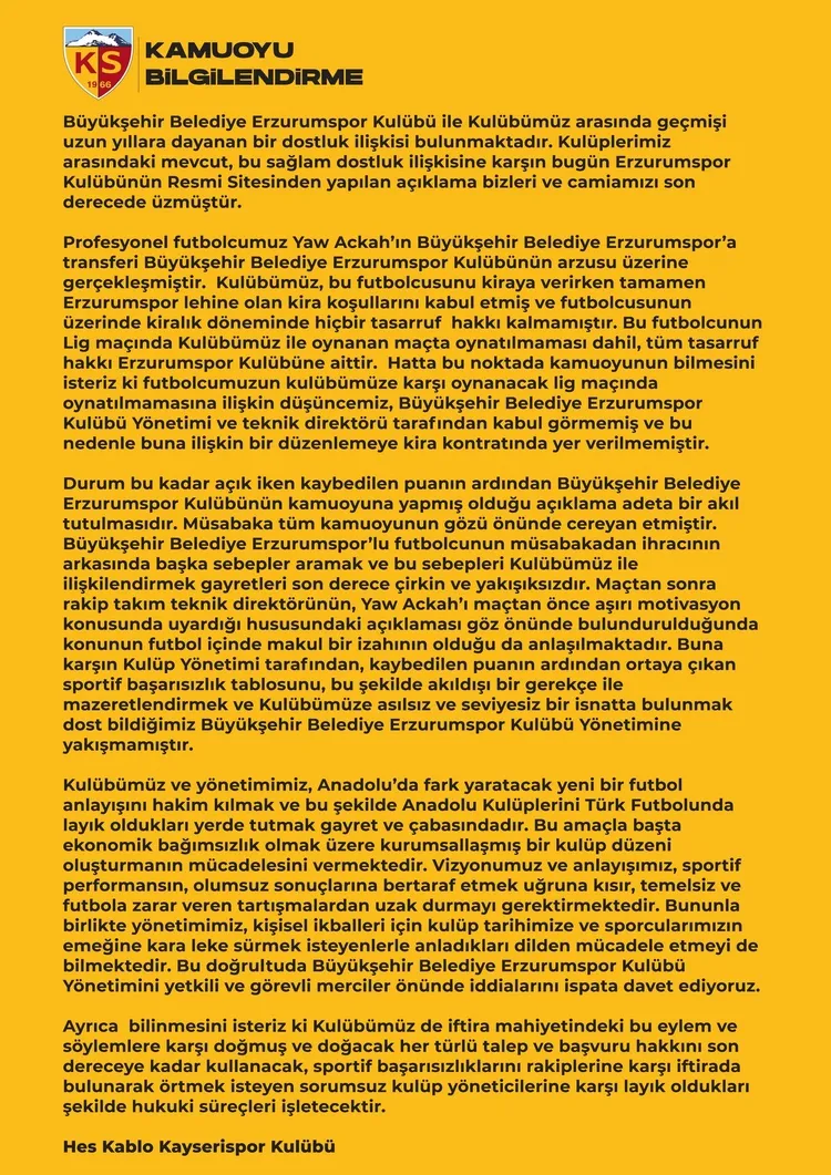 Kulübümüz ve yönetimimiz Anadolu'da fark yaratacak bir futbol anlayışını hakim kılmak ve bu şekilde Anadolu kulüplerini Türk futbolunda layık oldukları yerde tutma gayret ve çabasındadır. Bu amaçla başta ekonomik bağımsızlık olmak üzere kurumsallaşmış bir kulüp düzeni oluşturmanın mücadelesini vermektedir. Yönetimimiz kişisel ikballeri için kulüp tarihine ve sporcularımızın emeğine kara leke sürmek isteyenlerle anladıkları dilden mücadele etmeyi de bilmektedir. Bu doğrultuda Erzurumspor kulübü yönetimi terkili ve görevli merciiler önünde iddialarını ispata davet ediyoruz. Ayrıca bilinmesini isteriz ki kulübümüz de iftira mahiyetindeki bu eylem ve söylemlere karşı doğmuş ve doğacak her Türklü talep ve başvuru hakkını son dereceye kadar kullanacak, sportif başarısızlıklarını rakiplerine karşı iftirada bulunarak örtmek isteyen sorumsuz kulüp yöneticilerine karşı layık oldukları şekilde hukuki süreçleri işleteceklerdir. Hes Kablo Kayserispor Kulübü" ifadelerine yer verildi.