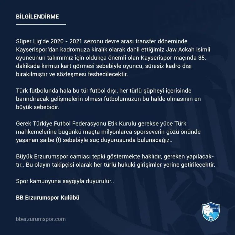 Büyükşehir Belediye Erzurumspor'dan yapılan açıklamada şu ifadeler kullanıldı: "Süper Lig'de 2020-2021 sezonu devre arası transfer döneminde Kayserispor'dan kadromuza kiralık olarak dahil ettiğimiz Jaw Ackah isimli oyuncunun takımımız için oldukça önemli olan Kayserispor maçında 35'inci dakikada kırmızı kart görmesi sebebiyle oyuncu, süresiz kadro dışı bırakılmıştır ve sözleşmesi feshedilecektir. Türk futbolunda hala bu tür futbol dışı, her türlü şüpheyi içerisinde barındıracak gelişmelerin olması futbolumuzun bu halde olmasının en büyük sebebidir. Gerek Türkiye Futbol Federasyonu Etik Kurulu gerekse yüce Türk mahkemelerine bugünkü maçta milyonlarca sporseverin gözü önünde yaşanan şaibe (!) sebebiyle suç duyurusunda bulunacağız. Büyük Erzurumspor camiası tepki göstermekte haklıdır, gereken yapılacaktır. Bu olayın takipçisi olarak her türlü hukuki girişimler yerine getirilecektir. Spor kamuoyuna saygıyla duyurulur."