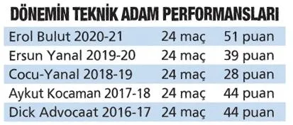Dick Advocaat yönetiminde 44 puan toplayan Fenerbahçe, Aykut Kocaman'la 44, Cocu-Ersun Yanal ile 28 ve Yanal ile 39 puanda kaldı. Erol Bulut ise bu süreçte 51 puan toplayarak 2015-16'daki Pereira performansına en çok yaklaşan teknik direktör oldu.