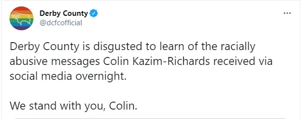 Derby County Futbol Kulübü, "Oyuncularımızdan biri Colin Kazım'ın sosyal medya aracılığıyla ırkçı olarak istismara uğradığını öğrenmiş olmaktan tiksiniyoruz." açıklaması yayınladı.
