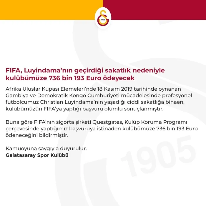 "Afrika Uluslar Kupası Elemeleri'nde 18 Kasım 2019 tarihinde oynanan Gambiya ve Demokratik Kongo Cumhuriyeti mücadelesinde profesyonel futbolcumuz Luyindama'nın yaşadığı ciddi sakatlığa binaen, kulübümüzün FIFA'ya yaptığı başvuru olumlu sonuçlanmıştır. Buna göre FIFA'nın sigorta şirketi Questgates, Kulüp Koruma Programı çerçevesinde yaptığımız başvuruya istinaden kulübümüze 736 bin 193 Euro tazminat ödeceğini bildirmiştir."