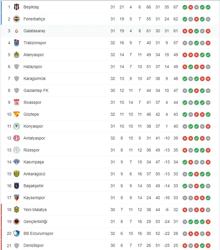 33. hafta güncel Süper Lig puan durumu tablosu ve maç sonuç detayları şöyle;