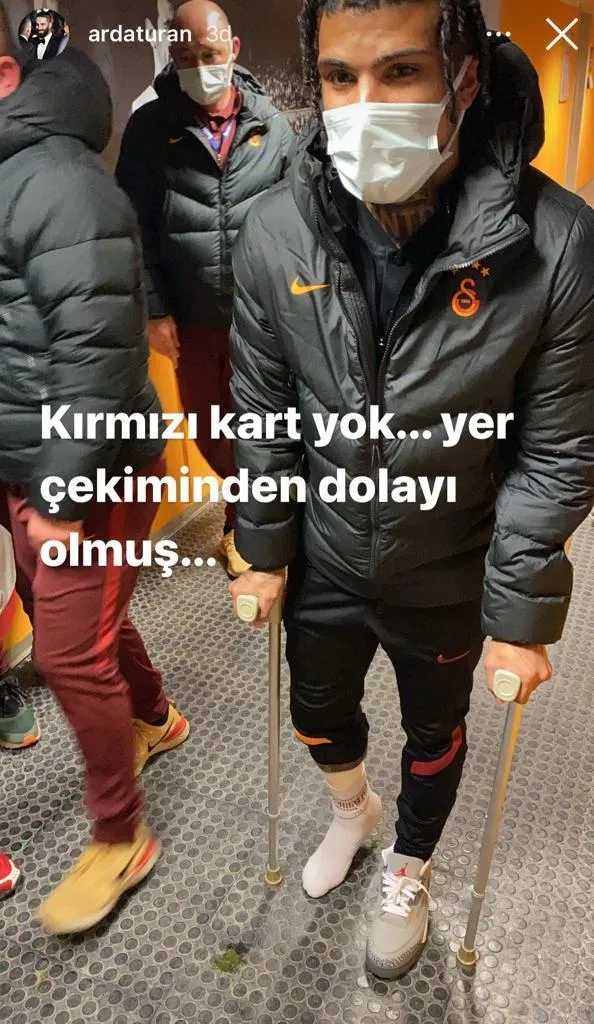 Galatasaray'ın kaptanı Arda Turan, Karagümrük maçında hafif sakatlığı nedeniyle forma giyememişti. Maçın ardından sosyal medya hesabından bir paylaşım yapan Arda Turan, Yedlin'in koltuk değneği ile yürüdüğü bir fotoğrafı paylaşarak, "Kırmızı kart yok... Yer çekiminden dolayı olmuş..." diye tepkisini gösterdi.