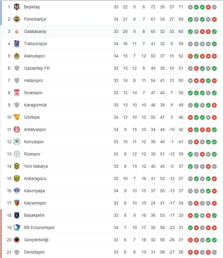 Lider Beşiktaş, Ankaragücü ile 2-2 berabere kaldı ve puanını 71'e yükseltti. Göztepe'yi deplasmanda 3-1 yenen Galatasaray ise 65 puana çıktı. Sarı-kırmızılı takım aradaki farkı 6'ya indirerek şampiyonluk yarışında yeniden umutlandı.