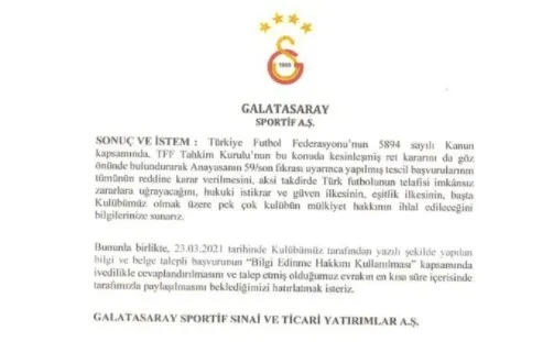 Bu gelişmelerin ardından Galatasaray'dan yeni bir hamle geldi. Sarı-kırmızılı kulüp TFF'ye adeta ültimatom niteliğinde bir başvuruda bulunarak Fenerbahçe'nin 1959 sezonu öncesi şampiyonlukları için yaptığı başvurunun reddini talep etti.