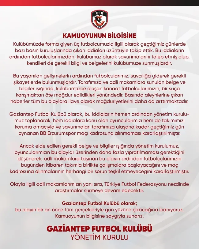 Gaziantep Futbol Kulübü olarak, bu iddiaların hemen ardından yönetim kurulumuz toplanarak, hem iddialara konu olan oyuncularımızı hem de takımımızı koruma amacıyla ve savunmaları tarafımıza ulaşana kadar geçtiğimiz gün oynanan BB Erzurumspor maçı kadrosuna alınmaması kararlaştırılmıştır.