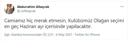 Galatasaray'da farklı yönetim listesinde olacağı iddia edilen Abdurrahim Albayrak, sosyal medya hesabından yaptığı açıklamada şu ifadeleri kullandı. 'Camiamız hiç merak etmesin, kulübümüzün olağan seçimi en geç Haziran ayında yapılacaktır.'