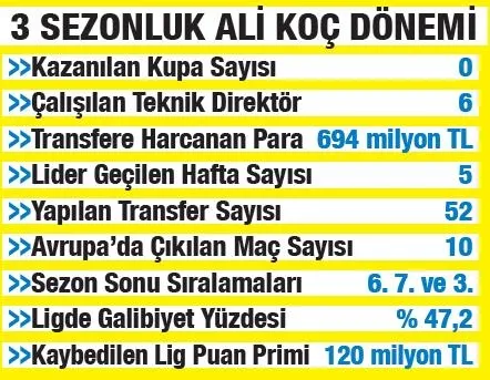 Başkanlığın ilk yılları hep zorlu geçmiştir, biz de zorlandık. Almamız gereken dersleri aldık. İkinci dönemimiz çok daha farklı olacak" diyen Koç'un 3 yılı tam bir hayal kırıklığıydı. Transfere 694 milyon TL harcayan, 52 transfer yapıp, 6 farklı hoca ile çalışan Koç, hiç kupa kazanamadı.