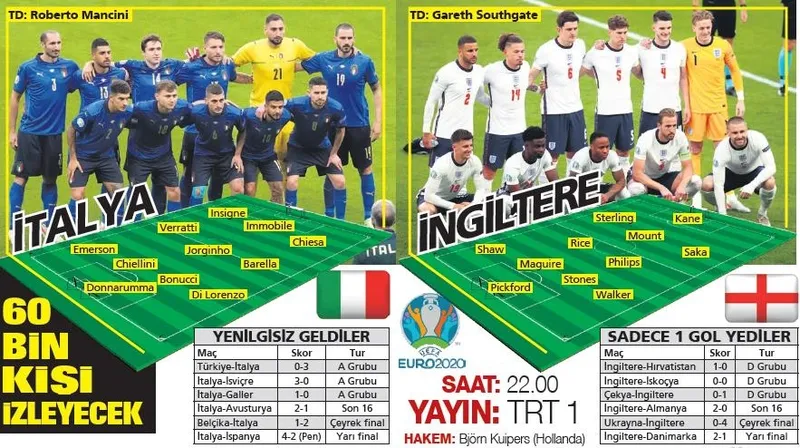 İtalya ile İngiltere, Avrupa Şampiyonluğu için bugün 22.00'de sahneye çıkıyor. 11 Haziran'da Roma'da İtalya-Türkiye ile açılışı yapılan turnuva Londra'da Wembley Stadı'ndaki maçla son bulacak. Tarihinde ilk kez Avrupa Şampiyonası finali gören İngiltere ilk kupasını da evinde kazanmak istiyor. İtalyanlar ise 1968'deki şampiyonluğun ardından 53 yıl sonra yine kupa için ter dökecek.