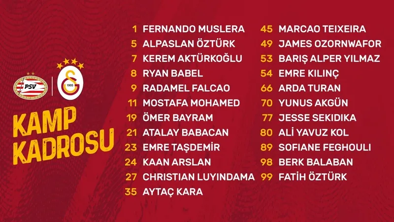 Öte yandan Galatasaray'ın PSV maçı kafilesi belli oldu. Kadroda kiralıktan dönen Mbaye Diagne lisansı çıkmayan Oğulcan Çağlayan ile tedavileri süren Taylan Antalyalı, Jimmy Durmaz, Emre Akbaba , DeAndre Yedlin yer almadı.