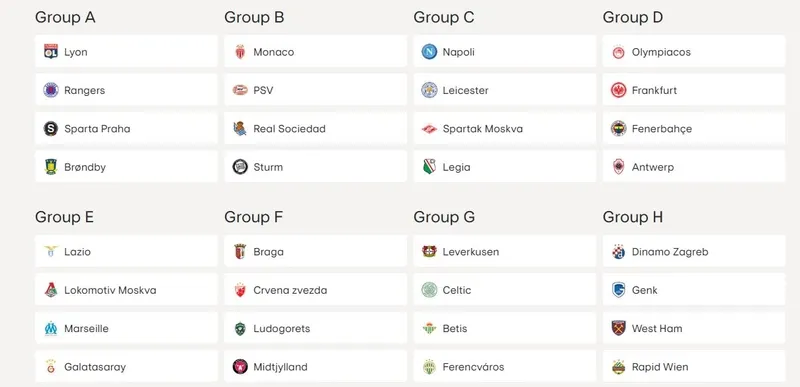 Ekipler, ligde dörderli 8 gruba ayrılacak. Torbaların, kulüplerin UEFA'daki sıralamasına göre belirleneceği kura çekiminde, aynı ülkenin takımları birbiriyle aynı grupta bulunamayacak. Grup birincileri doğrudan son 16 turuna yükselecek. Avrupa Ligi grup ikincileriyle UEFA Şampiyonlar Ligi gruplarını üçüncü sırada bitiren takımlar, son 16 turuna kalabilmek için play-off turunda karşılaşacak.