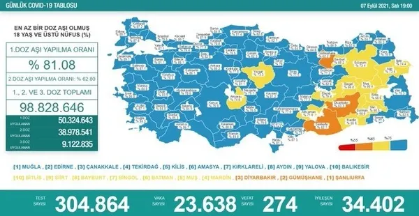 Koronavirüs tablosu ile ilgili vaka ve vefat sayısı Sağlık Bakanlığı resmi sitesinden duyuruluyor. Sağlık Bakanı Fahrettin Koca Twitter hesabı ile Sağlık Bakanlığı resmi internet sitesi üzerinden bugünkü koronavirüs tablosu merak ediliyor. Bilindiği üzere Türkiye'de bugüne kadar yapılan aşı sayısı toplam 99 milyon 582 bin 607'ye yükseldi. 9 Eylül 2021 koronavirüs tablosu açıklandı! 9 Eylül Sağlık Bakanlığı korona tablosu ile Türkiye'de vaka ve vefat sayısı kaç oldu? İşte corona tablosu son durum