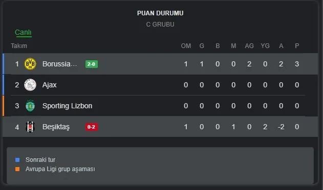 Şampiyonlar Ligi grup maçları kapsamında Borussia Dortmund ile karşım karşıya gelen Beşiktaş'ın sahada mağlup ayrılmasının ardından Beşiktaş kaçıncı sırada öğrenilmek istenerek UEFA Şampiyonlar Lig C grubu puan durumu nasıl? sorusuna yanıt aranmaya devam ediliyor.