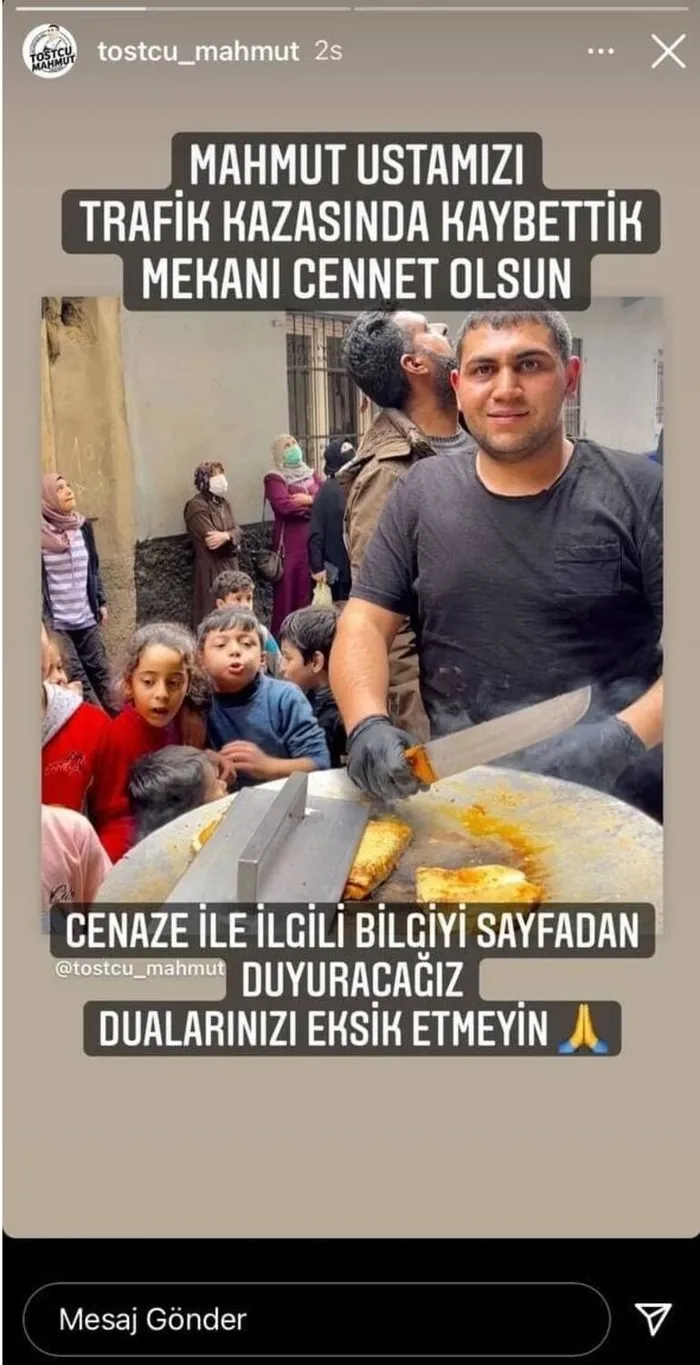 Tostçu Mahmut'un sosyal medya hesabından yapılan açıklamada "Mahmut ustamızı trafik kazasında kaybettik. Cenaze ile ilgili bilgiyi sayfamızdan duyuracağız. Dualarınızı eksik etmeyin." denildi.