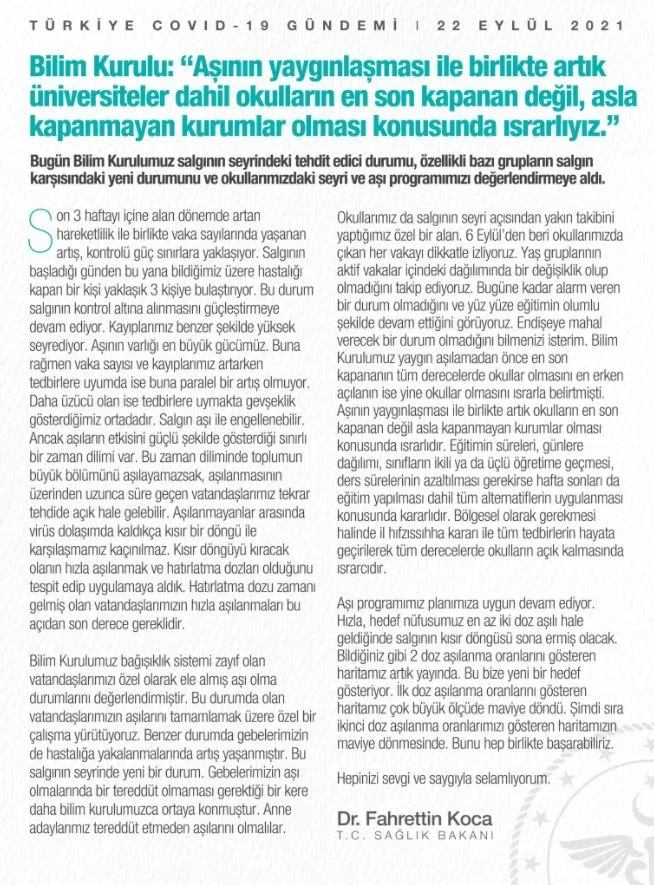 Fahrettin Koca yaptığı açıklamada yüz yüze eğitimden taviz verilmeyeceğini bildirirken aşılamayla hastalıkla mücadele edilebileceğini bildirdi. "Okullarımızda salgının seyri açısından yakın takibini yaptığımız özel bir alan. 6 Eylül'den beri okullarımızda çıkan her vakayı dikkatle izliyoruz. Yaş gruplarının aktif vakalar içindeki dağılımında bir değişiklik olup olmadığını takip ediyoruz. Bugüne kadar alarm veren bir durum olmadığını ve yüz yüze eğitimin olumlu şekilde devam ettiğini görüyoruz. Endişeye mahal verecek bir durum olmadığını bilmenizi isterim. Bilim Kurulumuz yaygın aşılamadan önce en son kapananın tüm derecelerde okullar olmasını en erken açılanın ise yine okullar olmasını ısrarla belirtmişti" dedi.