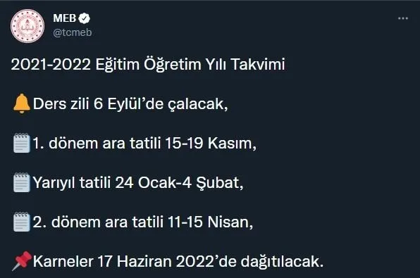 6 Eylül'de başlayan 1. Dönem 24 Ocak'ta sona erecek. Yarıyıl tatili (sömestr), 24 Ocak 2022 Pazartesi başlayıp 4 Şubat 2022 Cuma tamamlanacak.
