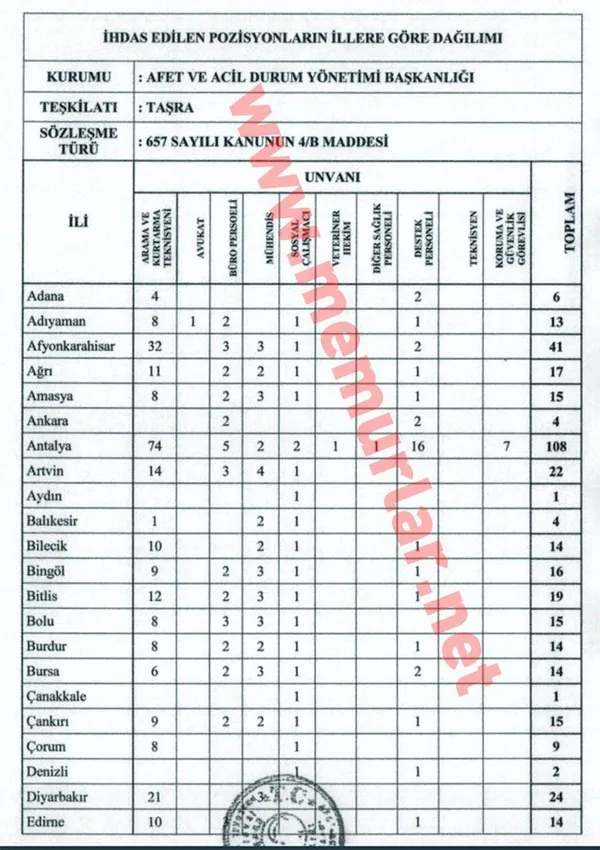 10 Eylül 2021 tarihli Cumhurbaşkanlığı onayı ile ihdas edilen ve onaylanan Afet ve Acil Durum Yönetimi Başkanlığı ( AFAD ) 1749 personel alımına ilişkin kadrolar ve kadrolara ilişkin sayılar belli oldu. İşte AFAD boş kadrolar;