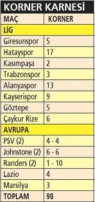 Galatasaray bu sezon henüz kornerden golle tanışamadı. Avrupa'da St.Johnstone, ligde de Çaykur Rize'den korner golü yiyen sarı-kırmızılı takımın duran top sorunu dikkat çekici. Lig ve Avrupa'da 16 resmi maça çıkan Galatasaray toplam 98 tane korner atışı kullandı.
