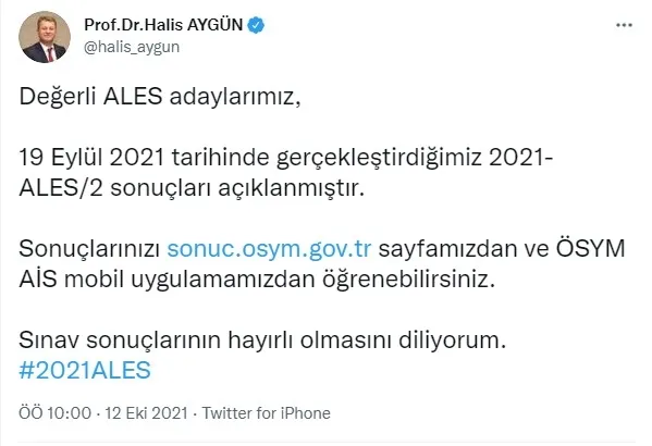 Değerli ALES adaylarımız, 19 Eylül 2021 tarihinde gerçekleştirdiğimiz 2021-ALES/2 sonuçları açıklanmıştır. Sonuçlarınızı https://sonuc.osym.gov.tr sayfamızdan ve ÖSYM AİS mobil uygulamamızdan öğrenebilirsiniz. Sınav sonuçlarının hayırlı olmasını diliyorum. #2021ALES