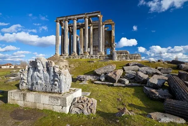 Kalıntılar arasında Anadolu'daki en iyi korunmuş Zeus Tapınağı, 15 bin kişi kapasiteli tiyatro ve tiyatroya bitişik nizamda yapılmış 13 bin 500 kişilik stadyum, iki hamam, dünyanın ilk ticaret borsa binası, sütunlu cadde, Kocaçay üzerinde ikisi ayakta kalmış beş köprü, iki agora, gymnasium, Meter Steunene kutsal alanı, nekropoller, antik bir bent, suyolları, kapı yapıları bulunmaktadır. Aizanoi antik kenti Efes, Bergama, Side gibi kentlerle çağdaştır.