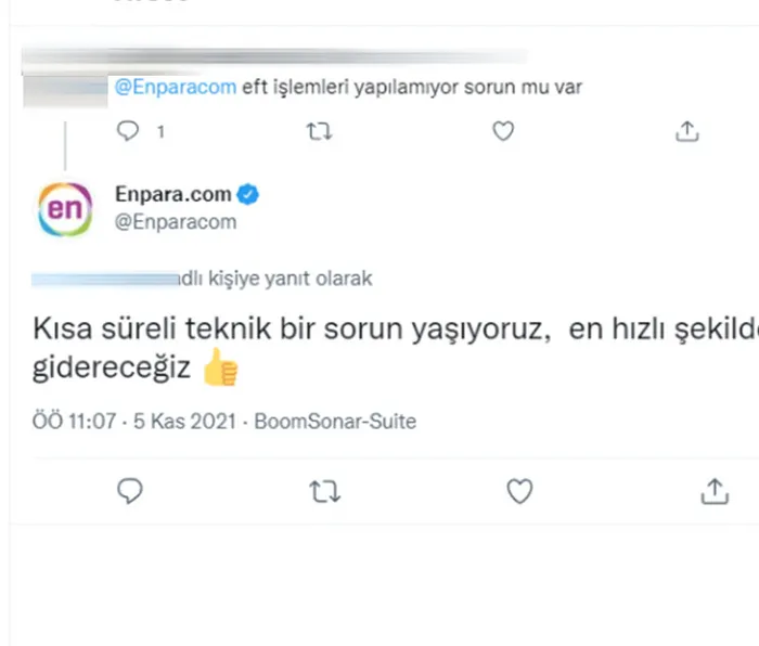 Sosyal medyada bazı kullanıcılar Enpara EFT sorunu yaşadıklarını dile getirdi. Konu ile ilgili araştırmalar sürerken Enpara.com resmi sosyal medya hesabından "Kısa süreli teknik bir sorun yaşıyoruz, en hızlı şekilde gidereceğiz" açıklaması yapıldı.