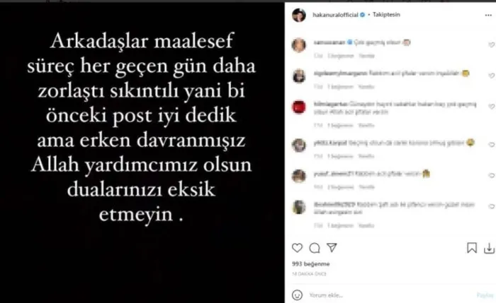Ancak bugün durumu ağırlaşan ünlü isimden yeni bir paylaşım geldi. Instagram hesabından yeni bir paylaşım yapan Ural, "Arkadaşlar maalesef süreç her geçen gün daha zorlaştı. Sıkıntılı yani. Bir önceki post iyi dedik ama erken davranmışız. Allah yardımcımız olsun dualarınızı eksik etmeyin" ifadelerini kullandı.