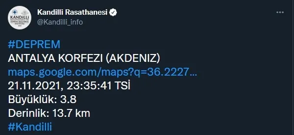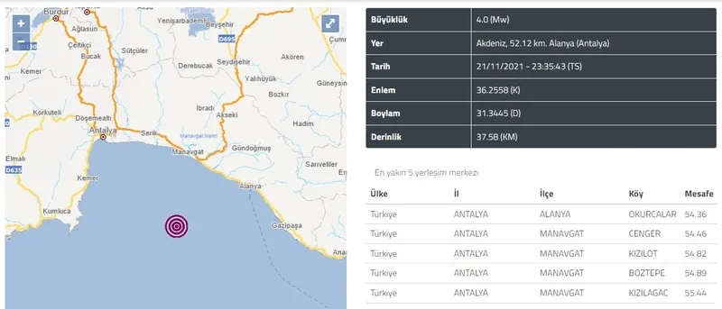 Boğaziçi Üniversitesi Kandilli Rasathanesi ve Afet ve Acil Durum Yönetimi Başkanlığı (AFAD)'ın sürekli olarak güncellediği ve kamuoyuna duyurdu son depremler listesine göre Akdeniz Antalya Körfezi açıklarında saat 23.35'de 4.0 şiddetinde bir son dakika depremi meydana geldi. Yerin 37.58 kilometre derinliğinde meydana gelen deprem ülkemizde Antalya ve çevre illerimizde de hissedildi. Sarsıntıların ardından çevre il ve ilçelerde yaşayan vatandaşlar da panik yaşadı.