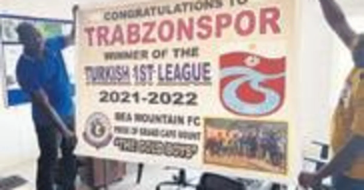 AFRİKA ülkesi Liberya'da liderin bir puan gerisindeki Bea Mountain FC, bu hafta şampiyonlukmaçına iş insanı Hazım Atay'ın tedarik ettiği formalarlaçıkacak. Liberya Futbol Federasyonu'ndan izin alan kulüp, formalarla ilk antrenmanını gerçekleştirdi. Kulüp yönetimi ayrıca maça Trabzonspor'a şampiyonluk mücadelesinde başarı dileyen bir pankart ile çıkacak