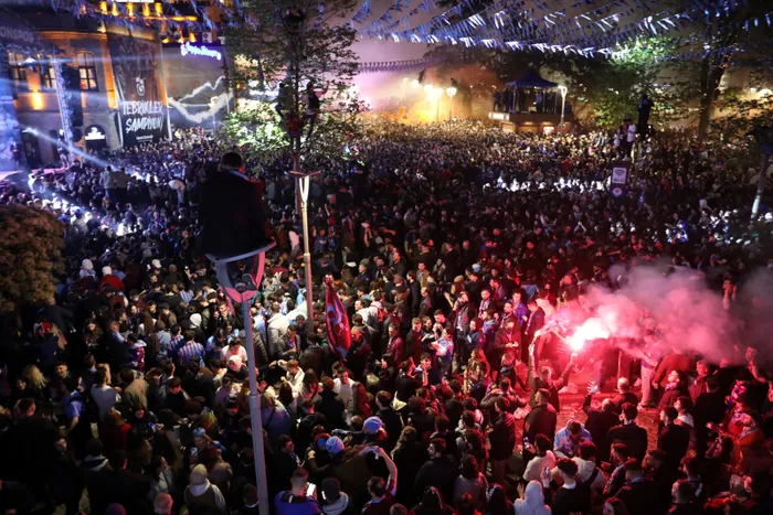 Trabzonspor Başkanı Ahmet Ağaoğlu, Asbaşkan Ertuğrul Doğan ve teknik direktör Abdullah Avcı, Antalya maçı sonrası taraftarı birlikte kasketleri ile selamladılar.