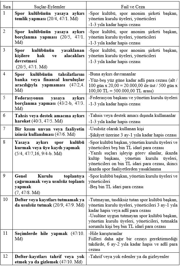 İsterseniz Spor Yasası alanında ülkemizdeki ilk kitap olan kendi kitabımda yer alan buna dair tabloyu sizinle paylaşayım. Sanırım adli ve idari ceza-tedbir hükümlerini bir arada ve tablo olarak vermek daha yararlı olabilir.