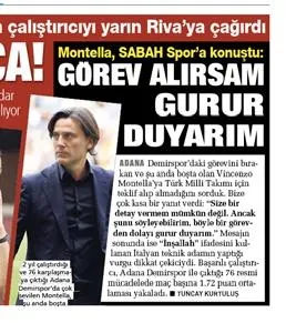 Montella, anlaşma öncesi arkadaşımız Tuncay Kurtuluş'a yaptığı açıklamada teklif gelmesi halinde gurur duyacağını söylemişti. Bu sözleri 19 Eylül'de SABAH Spor sayfalarında yer almıştı.