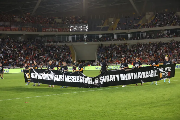 Hatay'ın deplasman maçlarına ev sahipliği yapan Mersin Stadyumu dün tarihi günlerinden birini yaşadı. 25 bine yakın taraftarın akın ettiği tribünler kapalı gişeydi. Galatasaray, 6 Şubat depremini en derinden yaşayan şehirlerden biri olan Hatay'ın acısını unutmadı. Isınmaya Atatürk'ün Hatay şehri için söylediği "Hatay benim şansı meselemdir" sözünün yazılı olduğu pankartla çıkıldı.