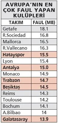 İspanyol Getafe'nin maç başına 18.1 faul ile ilk sırada bulunduğu listede Atakaş Hatayspor, 15.5 ortalamayla 5'inci basamakta yer alıp en agresif temsilcimiz oldu.
