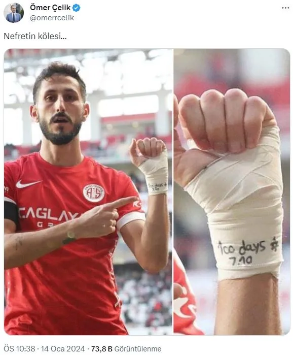 AK Parti Sözcüsü Ömer Çelik de İsrailli futbolcuya "Nefretin kölesi" sözleri ile tepki gösterdi.