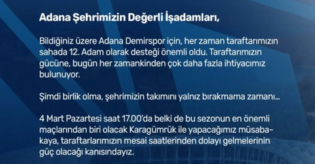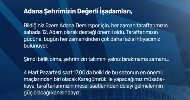 Mavi-Lacivertli ekipten yapılan açıklama, "Adana şehrimizin değerli iş adamları, bildiğiniz üzere Adana Demirspor için, her zaman taraftarımızın sahada 12. adam olarak desteği önemli oldu. Taraftarımızın gücüne, bugün her zamankinden çok daha fazla ihtiyacımız bulunuyor. Şimdi birlik olma, şehrimizin takımını yalnız bırakmama zamanı. 4 Mart Pazartesi saat 17.00'da belki de bu sezonun en önemli maçlarından biri olacak Karagümrük ile yapacağımız müsabakaya, taraftarlarımızın mesai saatlerinden dolayı gelmelerinin güç olacağı kanısındayız. Şehrimizin takımının yalnız kalmaması, 12. adamın Yeni Adana Stadyumu'nu doldurabilmesi için siz değerli iş verenlerin özverisine ihtiyacımız bulunuyor. Bu müsabakaya, büyük Adana Demirspor taraftarlarının gelebilmesi için işyerlerinden izinli sayılmaları hususunu değerlendirme ve bilgilerinize sunarız" denildi.