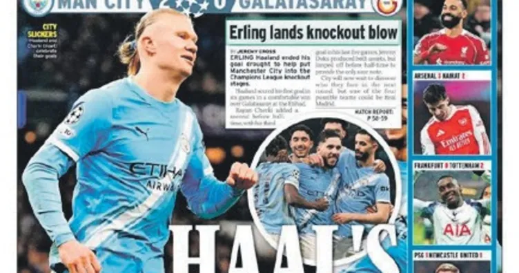 İngiliz medyası, Manchester City'nin Galatasaray'ı mağlup ettiği maçta Haaland'ı göklere çıkardı. Norveçli oyuncunun golünü karşılaşmanın seyrini değiştiren adım olarak gören medya, İkinci yarıda ise temkinli bir oyun sergilendiği ve Galatasaray karşısında iyi savunma yapıldığının altını çizdi.
