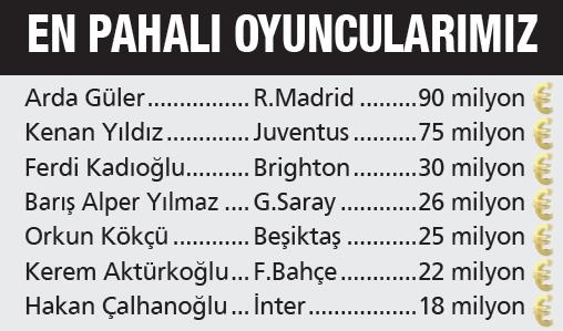 Böylece 2026 Dünya Kupası'nda boy gösterecek 48 takımın içinde en kıymetli 13'üncü kadroya sahip olduk. İlk üç sırada İngiltere (1.6 milyar Euro), Fransa (1.4 milyar Euro) ve İspanya (1.3 milyar Euro) yer alıyor. Milli Takımımızın 2024'teki toplam değeri 420 milyon Euro'ydu. Dünya Kupası'na gidecek kadromuzda şu an için majör liglerde forma giyen 11 oyuncu yer alırken Süper Lig'den 15 futbolcu bulunuyor.