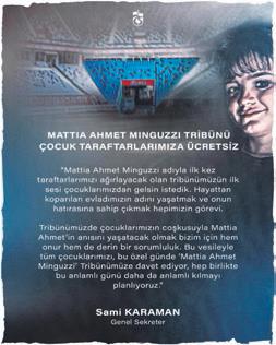 Trabzonspor'un Ziraat Türkiye Kupası yarı finalinde yarın Papara Park'ta saat 20.30'da Göztepe ile oynayacağı karşılaşmada, Mattia Ahmet Minguzzi Tribünü çocuk taraftarlara ücretsiz olacak. 23 Nisan Ulusal Egemenlik ve Çocuk Bayramı vesilesiyle böyle bir karar alan bordo- mavili kulüp, Mattia Ahmet Minguzzi'nin anısını yaşatmak amacıyla geçtiğimiz günlerde Fırtına Tribünü'nün adını değiştirmişti.